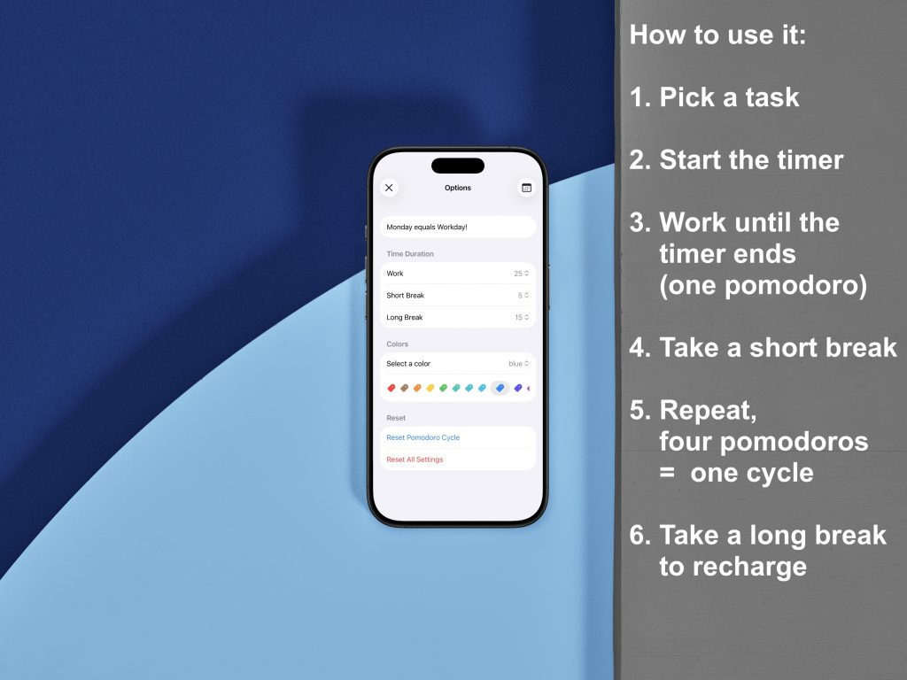 - Customizable to You – Adjust work/break lengths, pick colors that inspire you, and name each session (e.g., “Feature X” or “Research”) for instant context.